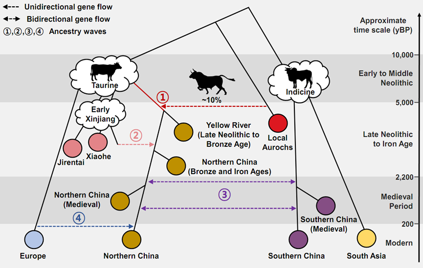 東亞地區家牛的四次融合事件 圖片來源:中國吉林大學網站 該研究由中國吉林大學生物考古實驗室、考古學院蔡大偉教授團隊聯合韓國首爾大學Choongwon Jeong教授團隊及中國數十家考古研究機構完成。 研究團隊整合了來自中國數十處遺址的166例古代牛科樣本,覆蓋近萬年時間跨度,構建了迄今為止全球規模最大、時間序列最完整的東亞古代牛基因組數據集。研究打破了以往關於東亞地區家牛“單一起源”的傳統觀點,揭示其形成是多次外來輸入與本地種群深度融合的漸進過程。 該研究成果顯示,距今約5000年前的新石器時代晚期,普通牛傳入黃河流域並與本土野生原牛發生基因交流;新疆地區的早期家牛受到西亞普通牛和南亞瘤牛的共同影響,自青銅時代晚期至鐵器時代不斷向黃河流域滲透,持續影響了中國北方家牛的遺傳結構。鐵器時代至明清時期,南北方牛群進一步融合,最終奠定了現今中國南北方家牛的基本遺傳框架。(完) 【編輯:林曉惠】