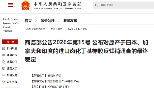 圖片來源:中國商務部網站截圖 據介紹,2020年12月,中國商務部公告,決定自當月20日起,對原產於美國、韓國和歐盟的進口三元乙丙橡膠徵收反傾銷稅,實施期限為5年。又據中國商務部2021年公告,2020年12月31日英國脫歐過渡期結束後,之前已對歐盟實施的貿易救濟措施繼續適用於歐盟和英國,實施期限不變;該日期後對歐盟新發起的貿易救濟調查及複審案件,不再將英國作為歐盟成員國處理。 2025年10月17日,中國商務部收到國內三元乙丙橡膠產業提交的反傾銷措施期終複審申請書。申請人主張,如果終止反傾銷措施,原產於美國、韓國和歐盟的進口三元乙丙橡膠對中國的傾銷可能繼續或再度發生,對中國產業造成的損害可能繼續或再度發生。申請人未對原產於英國的進口三元乙丙橡膠所適用的反傾銷措施提出期終複審申請。 經調查,中國商務部決定自2025年12月20日起,對原產於美國、韓國和歐盟的進口三元乙丙橡膠所適用的反傾銷措施進行期終複審調查,調查應於2026年12月20日前(不含本日)結束。其間,中國對原產於美國、韓國和歐盟的進口三元乙丙橡膠繼續按照商務部2020年公告公布的徵稅產品範圍和稅率徵收反傾銷稅。自2025年12月20日起,對原產於英國的進口三元乙丙橡膠所適用的反傾銷措施到期終止。(完) 【編輯:林曉惠】