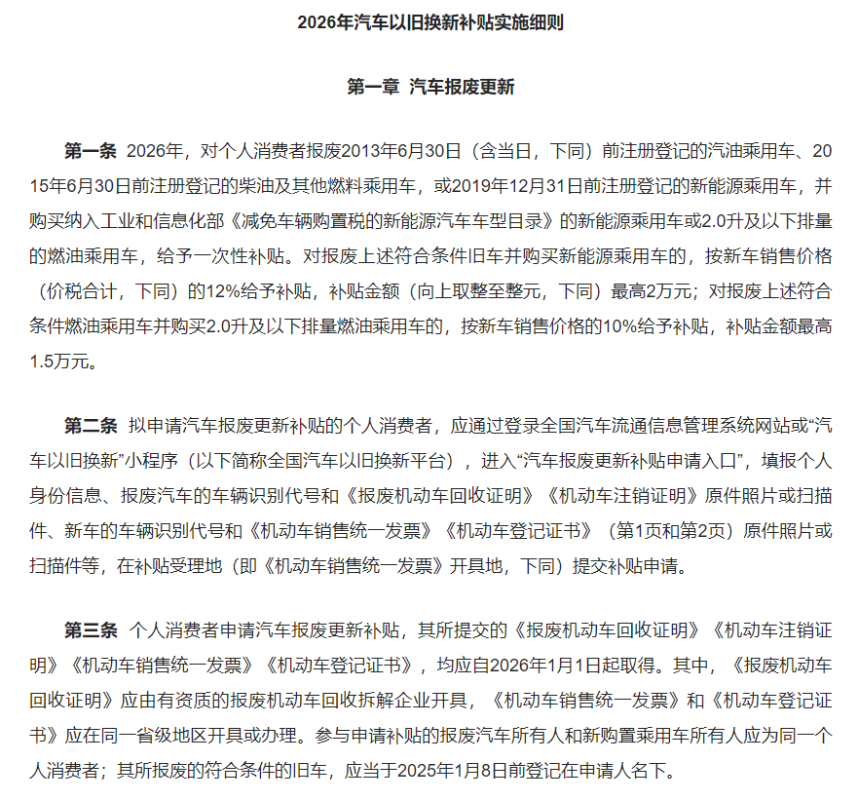 圖源:中國商務部網站截圖 細則對不同燃料類型乘用車的報廢舊車註冊登記時間作出具體規定:汽油乘用車需在2013年6月30日之前註冊登記;柴油及其他燃料乘用車需在2015年6月30日之前註冊登記;新能源乘用車需在2019年12月31日之前註冊登記。相比2025年,政策支持範圍進一步擴大。 補貼標準方面,汽車以舊換新按照新車售價比例給予補貼。其中,報廢更新最高補貼額度為2萬元,置換更新最高補貼額度為1.5萬元。 另外,中國國家發展改革委、財政部近日發布關於2026年實施大規模設備更新和消費品以舊換新政策的通知,其中包括支持汽車報廢更新,購買新能源乘用車補貼車價的12%(最高不超過2萬元)、購買2.0升及以下排量燃油乘用車補貼車價的10%(最高不超過1.5萬元)。(完) 【編輯:彭玉婷】