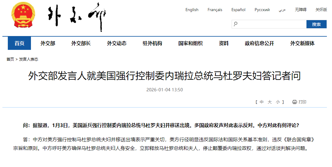 圖源:中國外交部網站截圖 中國外交部發言人說,中方對美方強行控制馬杜羅總統夫婦並移送出境表示嚴重關切,美方行徑明顯違反國際法和國際關係基本準則,違反《聯合國憲章》宗旨和原則。中方呼籲美方確保馬杜羅總統夫婦人身安全,立即釋放馬杜羅總統和夫人,停止顛覆委內瑞拉政權,通過對話談判解決問題。(完) 【編輯:彭玉婷】