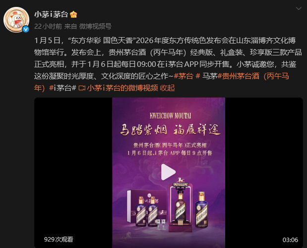 圖源:“i茅台”微博截圖 據介紹,貴州茅台酒(丙午馬年)產自貴州茅台酒地理標誌保護核心產區,以本地優質糯高粱、小麥、水為原料,採用科學獨特的貴州茅台酒傳統工藝精心釀製。2026年農歷丙午馬年,五行屬“陽火”。為呼應這一屬性,貴州茅台酒(丙午馬年)以2026年度東方傳統色“齊紫”為主色調,色彩典雅而莊重,深邃而大氣。 此次推出的馬年生肖茅台包括經典版、珍享版、禮盒裝三款規格,覆蓋1899元至3789元人民幣價格帶,銷售模式採用寄售與經銷體系並行。 這也是茅台生肖系列步入第二個12年輪迴的標誌性產品,受到市場廣泛關注。貴州茅台2014年首推生肖系列產品貴州茅台酒(甲午馬年),此後這一系列已完成首個生肖周期布局。眼下,2014年貴州茅台酒(甲午馬年)較首發價漲幅已超17倍。 內地媒體“第一財經”本月6日引述業內人士分析稱,往年“生肖茅台”龍茅、蛇茅都出現過上市之初價格被爆炒、隨後又跌破發行價的情況,因此此次熱炒行情能持續多久並不好判斷,風險較大。(完) 【編輯:彭玉婷】