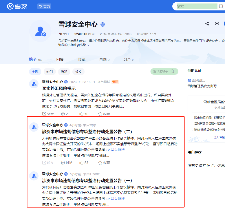 圖源:雪球網站截圖 首批被封禁的賬號包括“杭州新城路”、“輪迴666”、“福祿娃爺爺”;隨後,“佛系萬梅作手”、“武漢劉青正”、“鄭州復興路”、“主線龍”等多個賬號亦被納入處置名單。雪球強調,上述賬號存在誘導跟風交易、編造內幕消息、組織團夥炒作等嚴重擾亂市場秩序的行為。 據悉,此次專項整治聚焦四大重點:一是打擊以“游資戰法”、 “曬盤”、“帶隊”等方式誘導散戶跟風交易的操縱行為;二是嚴查無資質人員通過“付費加群”、“交流指導”等名義導流至第三方平台進行非法證券投資諮詢;三是清理操控“馬甲號”、“矩陣號”製造虛假熱度的黑灰產團夥;四是禁止利用AI生成內容或“小作文”捏造謠言、歪曲政策、散布不實信息。 就在公告發布前夕,浙江證監局於1月19日公布對雪球大V“金浤”(真名金永榮)的行政處罰決定:因其長期通過多平台發布薦股內容,實施“搶帽子”操縱,被沒收違法所得4162萬元(人民幣,下同),並處等額罰款,合計罰沒超8300萬元,同時被採取3年證券市場禁入措施。據悉,其雪球賬號粉絲超10.7萬,單篇帖文平均閱讀量高達130萬次。 據介紹,這是雪球響應中國證監會系統工作會議精神及國家網信辦、證監會聯合開展的“涉資本市場網上虛假不實信息專項整治”行動的重要舉措。(完) 【編輯:彭玉婷】