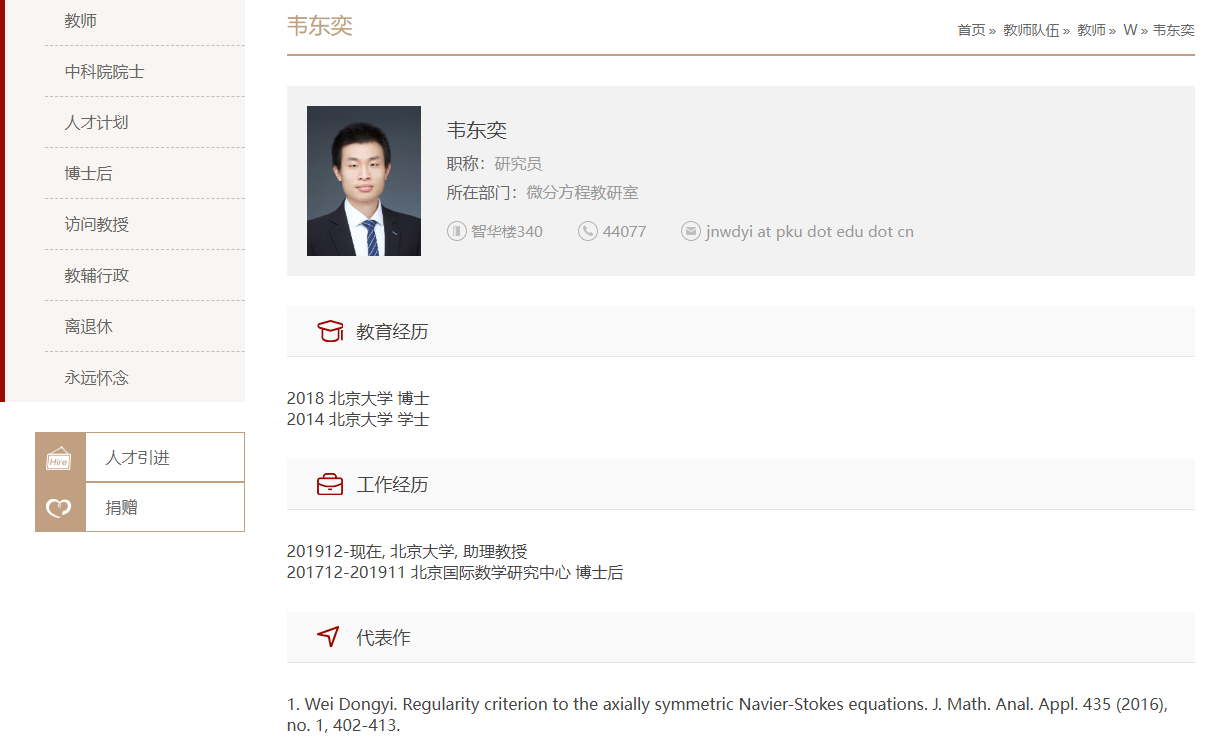 韋東奕個人資料。圖源:北京大學官網截圖 綜合20日消息,韋東奕提名者為兩位中國科學院院士——動力系統專家文蘭與低維拓撲學家王詩宬,彰顯學界對其科研成就的高度認可。 根據公示文件,韋東奕憑借在基礎數學領域的突出貢獻獲此提名。他1991年出生於山東濟南,籍貫浙江東陽,高中就讀於山東師大附中期間,曾連續在第49屆、第50屆國際數學奧林匹克競賽(IMO)中以滿分摘得金牌,展現出非凡的數學天賦。2010年,他被保送進入北京大學,隨後加入“本博連讀特別計劃”,2019年博士畢業後留校任教,28歲起擔任助理教授,於2025年11月以副教授身份公開亮相。 2025年9月,由韋東奕與章志飛共同完成的項目《流動轉捩機理的數學研究》通過國家自然科學獎初評,建議授二等獎,標誌著其研究成果已進入國家級科技獎勵視野。該項目將深奧的數學理論應用於流體力學關鍵問題,體現了基礎科學對前沿工程問題的支撐作用。 2021年一次接受採訪時手拎礦泉水、懷抱饅頭意外走紅網絡,被網友親切稱為“韋神”,但韋東奕始終專注於科研與教學。據北大官網介紹,他自2017年起在北京國際數學研究中心從事博士後研究,長期深耕偏微分方程、幾何分析等領域。(完) 【編輯:彭玉婷】