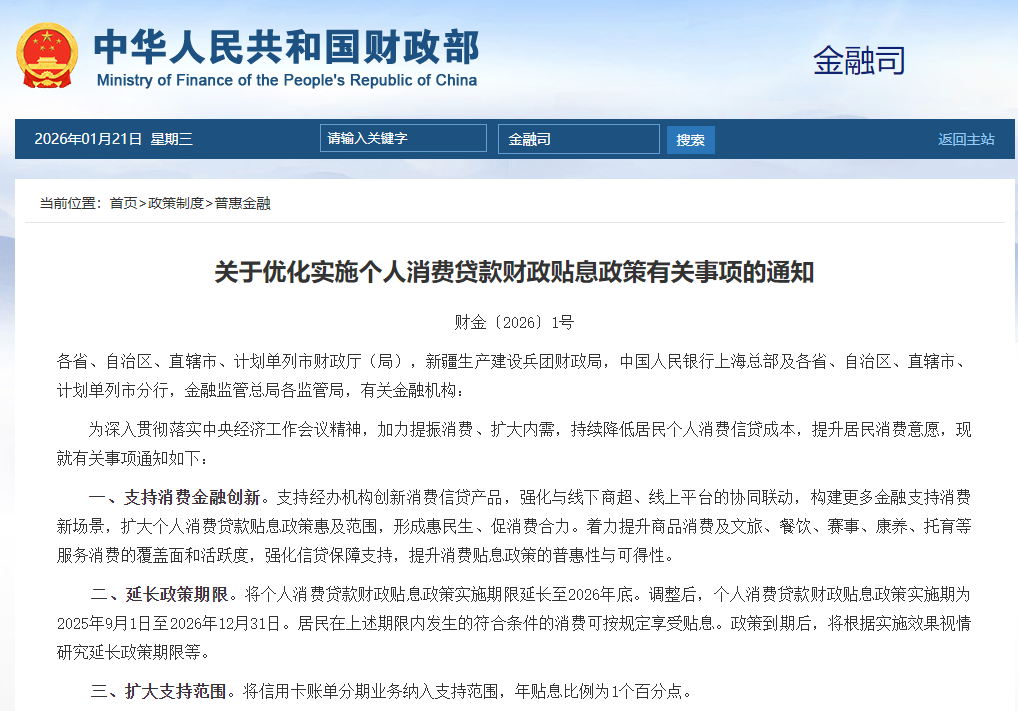 圖源:中國財政部官網截圖 此次政策優化最大亮點在於大幅擴大支持範圍與提高貼息靈活性。首先,信用卡賬單分期業務首次被納入財政貼息範疇,年貼息比例為1個百分點。這意味著居民將日常消費轉為分期付款後,亦可享受政府補貼,有助於緩解短期資金壓力。 其次,貼息標準顯著放寬:取消單筆消費貼息上限500元(人民幣,下同)的限制,同時廢除5萬元以下消費累計貼息不超過1000元的規定。儘管每名借款人在單一經辦機構每年累計貼息上限仍維持3000元不變,但政策不再區分消費領域(過去僅限汽車、教育、文旅等重點領域),如今所有真實合規的個人消費貸款均可享受貼息,提升政策普惠性。 此外,政策還擴充經辦機構範圍,將監管評級3A及以上的城市商業銀行、農村合作金融機構、外資銀行、消費金融公司及汽車金融公司等納入體系,進一步延伸服務覆蓋面與便利性。 與此同時,中央首批625億元超長期特別國債已下達各地,用於支持今年延續實施的消費品以舊換新政策。財政部相關負責人表示,個人消費貸款貼息與以舊換新、服務業主體貸款貼息等政策協同發力,從需求端與供給端雙向促進,以“真金白銀”降低居民消費成本,鞏固經濟回升向好態勢。(完) 【編輯:彭玉婷】