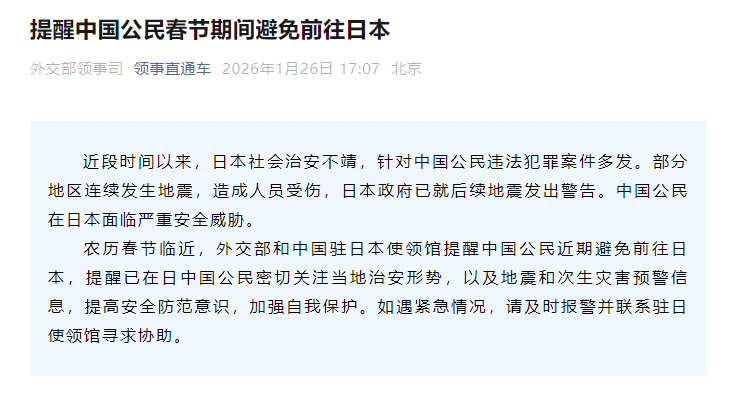 圖源:外交部領事司微信公眾號“領事直通車”截圖 外交部領事司微信公眾號“領事直通車”提示:近段時間以來,日本社會治安不靖,針對中國公民違法犯罪案件多發。部分地區連續發生地震,造成人員受傷,日本政府已就後續地震發出警告。中國公民在日本面臨嚴重安全威脅。 農曆春節臨近,外交部和中國駐日本使領館提醒中國公民近期避免前往日本,提醒已在日中國公民密切關注當地治安形勢,以及地震和次生災害預警信息,提高安全防範意識,加強自我保護。如遇緊急情況,請及時報警並聯繫駐日使領館尋求協助。 同日,多家中國航司宣布日本航線免退改新政策。 國航、東航、南航發布通知稱,1月26日前出票,航班起飛日期在2026年3月29日(含)至10月24日(含)的日本進出港或經停航班,可免費退改簽。在此之前,免費退改簽政策執行到3月28日。 日本政府觀光局1月21日公布的數據顯示,2025年12月中國內地訪日遊客數量為33.04萬人次,比上年同期大幅下降45.3%。 據央視新聞報道,從網絡平台了解到,2025年12月中國境內到日本的計劃航班中超40%的航班取消。據第三方出行平台APP民航看板數據顯示,2026年第一周(2025年12月29日至2026年1月4日),中國內地至日本航線實際執行往返航班量同比下降41%。(完) 【編輯:彭玉婷】