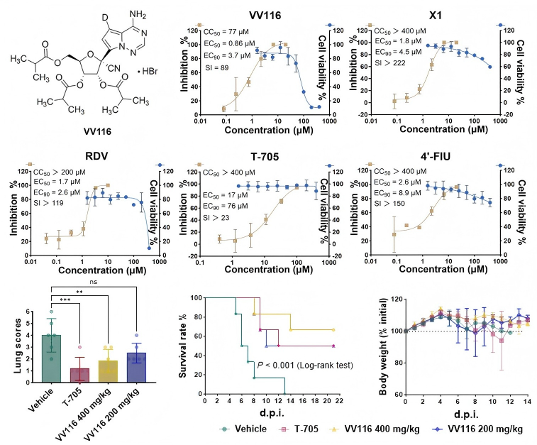 圖源:中科院武漢病毒研究所網站截圖 尼帕病毒(Nipah virus)自1998年首次在馬來西亞暴發以來,已成為全球公共衛生領域高度關注的高致病性病原體,其致死率高達40%至70%。2023年至2026年間,印度和孟加拉國持續出現疫情,暴發頻率和地理範圍均呈上升趨勢。2026年1月,印度西孟加拉邦及周邊地區再次出現疫情,已有死亡病例,近百名密切接觸者被隔離。由於尼帕病毒宿主範圍廣、致死率高,且目前尚無獲批的藥物或疫苗,世界衛生組織(WHO)將其列為最高優先級的區域性威脅。 近期,中國科學院武漢病毒研究所蕭庚富/張磊砢研究員團隊、單超研究員團隊,聯合上海藥物研究所、旺山旺水生物醫藥股份有限公司胡天文博士,在國際期刊Emerging Microbes&Infections上發表了有關VV116 的重要研究成果,證實口服核苷類藥物VV116對尼帕病毒具有顯著的抗病毒活性,為這一高致死性新發傳染病的防治帶來新希望。