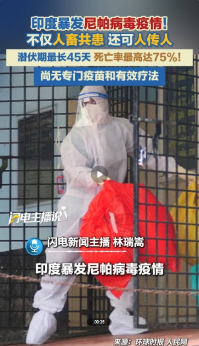 香港新聞網1月28日電   1月27日,中國海關總署衞生檢疫司發布境外旅行健康提示:據印度媒體報道,印度東部的西孟加拉邦近日出現尼帕病毒病疫情,目前已確認5例感染病例,其中包括醫護人員。尼帕病毒病(Nipah virus disease)是由尼帕病毒引起的人畜共患傳染病,主要發生在南亞和東南亞國家,中國尚無人感染尼帕病毒病的報告。前往尼帕病毒病疫情發生國家(地區)時,應密切關注疫情動態,做好個人防護,科學應對疫情。