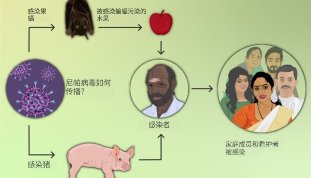 果蝠是尼帕病毒的自然宿主。人感染尼帕病毒病的傳染源主要為被病毒感染的動物和人。尼帕病毒傳播到人主要通過直接接觸被病毒感染的動物(如果蝠、豬、馬等)或其體液(如血液、尿液、唾液等);食用被病毒感染動物的體液、分泌物或排洩物所污染的食品(如被果蝠污染的水果);密切接觸被病毒感染的病人或其體液(包括鼻咽分泌物、尿液或血液等)。人對尼帕病毒普遍易感。