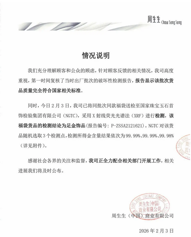 同日,周生生已將同批次同款福袋送檢至國家珠寶玉石首飾檢驗集團有限公司(NGTC),採用X射線熒光譜法(XRF)進行檢測,該福袋貨品的檢測結論為足金飾品(報告編號:P-ZSSA2121621)。NGTC對該貨品隨機選取3個檢測點,檢測所得金含量結果依次為 99.99%、99.99%、99.98%。 該公司指出,正全力配合相關部門開展工作,相關進展將及時公布。(完) 【編輯:黃璇】