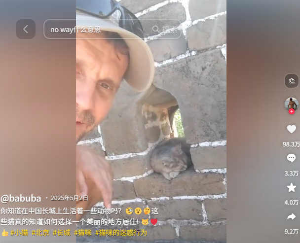 資料圖為外國遊客拍攝的“長城貓”短視頻截圖 社交平台上,有人發布了自己與“長城貓”互動、合影的短視頻、照片,畫面迅速俘獲了全球網友的心。許多人在評論區表達對貓咪的喜愛,甚至表示“想飛去中國親自擼貓”。 中國教育電視台旗下“育見新聞”公眾號5日對此發表評論稱:“這幾年,中國文化對外傳播的方式正在變‘輕’。從潮玩到動畫,越來越多人通過輕鬆有趣的方式認識中國。‘長城貓’也是如此——它不是刻意的輸出,卻讓人自然感受到這裡的開放與生動。”(完) 【編輯:彭玉婷】