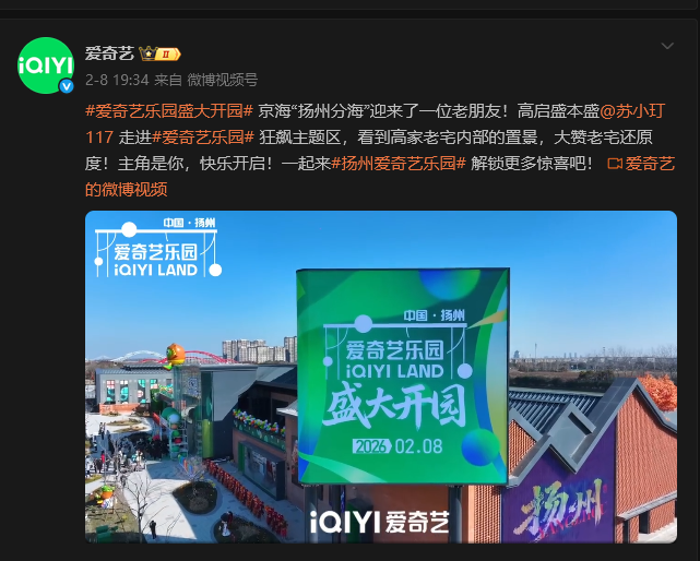 圖源:“愛奇藝”社媒截圖 綜合媒體9日消息,樂園由愛奇藝與揚州城控集團合作打造,佔地約一萬平方米,主打“小型化、快迭代、強互動”模式。區別於傳統大型戶外樂園,其通過全感劇場、VR/XR技術、旋轉舞台等手段,將《蓮花樓》、《唐朝詭事錄》、《狂飆》、《大話西遊》等熱門IP轉化為可觸摸、可參與的沉浸式體驗。遊客可穿越至長安探案、淩空飛越運河,或在復刻“舊廠街”中打卡合影。 8日開園當天,愛奇藝創始人龔宇表示,這是公司從線上邁向線下的關鍵一步,旨在激活IP全生命周期價值。樂園採用通票制,涵蓋演藝、互動、餐飲及限定商品,構建“線上種草—線下體驗—社交傳播”閉環。多位劇中演員如王鶴潤、蘇小玎、楊志剛等現身園區,與遊客互動,強化情感連接。 龔宇強調,選址揚州基於其文旅潛力與市場空白,而輕資產、高效率的運營模式更適配中國城市結構。據悉,開封、北京兩地的愛奇藝樂園已在建設中,未來將結合在地文化持續拓展。(完) 【編輯:彭玉婷】