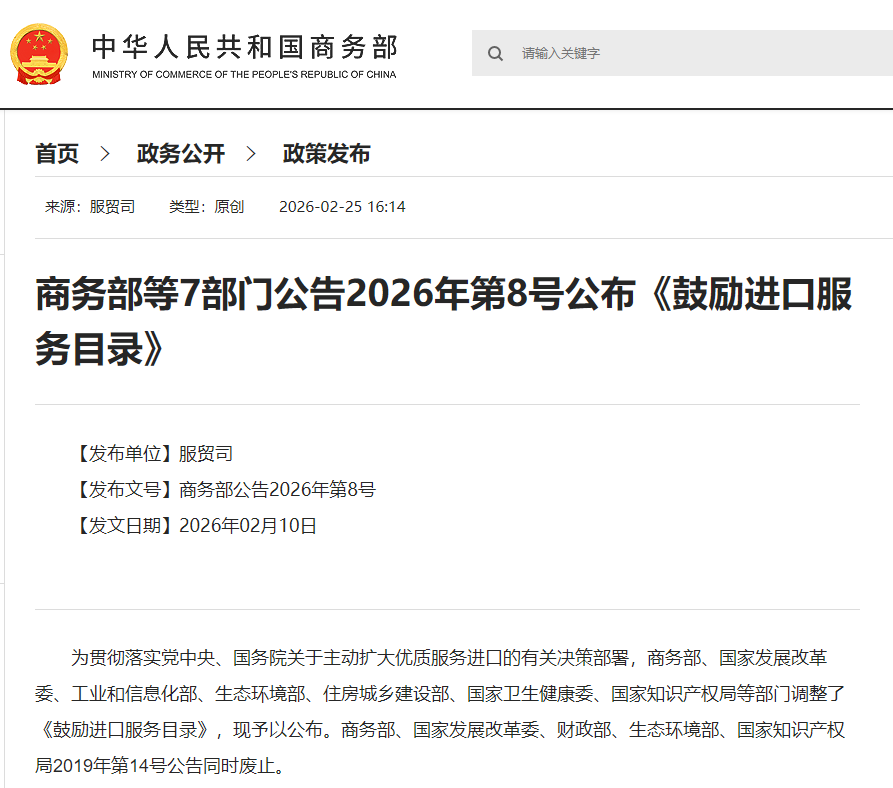 中國商務部等七部門25日聯合發布新版《鼓勵進口服務目錄》。圖源:中國商務部網站截圖 據目錄指出,此次調整旨在擴大優質服務進口,更好支撐高質量發展和新質生產力培育。目錄聚焦兩類需求:一是生產性服務,如高端研發、綠色低碳技術、工業設計等,助力產業升級;二是生活性服務,如優質醫療、健康管理等,回應民眾對更高生活品質的期待。 此外,制定原則強調“國內急需”。只有能補短板、促轉型、惠民生的服務才被納入;同時排除涉及國家安全或國內明令禁止開放的領域。此外,新目錄也與各行業主管部門現有政策保持銜接,避免重複或衝突。 隨著這份目錄出台,相關進口服務有望在審批、稅收或資金支持等方面獲得更便利條件。分析指,這也釋放出中國持續擴大高水平對外開放、從“商品進口”向“服務進口”拓展的明確信號。(完) 【編輯:彭玉婷】