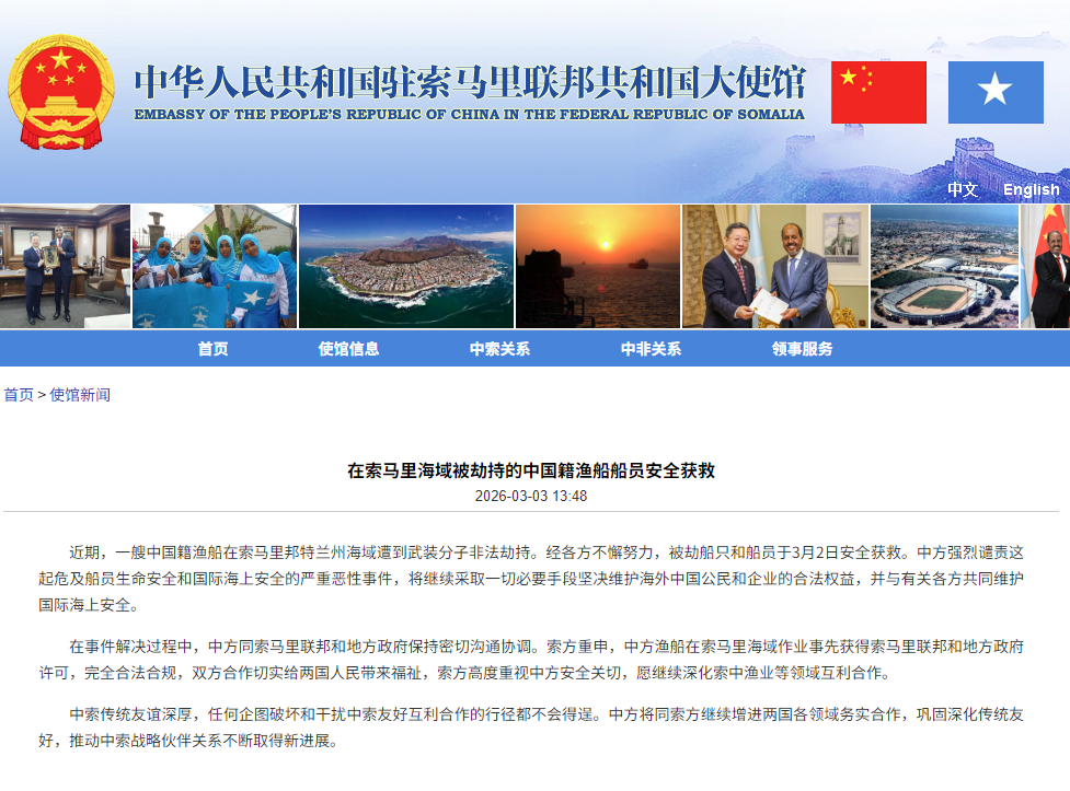 圖源:中國駐索馬里大使館網站截圖 中方強烈譴責這起危及船員生命安全和國際海上安全的嚴重惡性事件,將繼續採取一切必要手段堅決維護海外中國公民和企業的合法權益,並與有關各方共同維護國際海上安全。 在事件解決過程中,中方同索馬里聯邦和地方政府保持密切溝通協調。索方重申,中方漁船在索馬里海域作業事先獲得索馬里聯邦和地方政府許可,完全合法合規,雙方合作切實給兩國人民帶來福祉,索方高度重視中方安全關切,願繼續深化索中漁業等領域互利合作。 此前,中國駐索馬里大使館於1月4日發布消息稱,大使館提醒中國公民、企業務必充分了解中國政府相關指導政策,慎重評估各類風險因素,禁止前往極高危地區,在索馬里境內及所屬海域注意防範風險,確保安全。 索馬里去年也曾發生中國籍漁船被非法控制事件。2025年1月,一艘中國籍漁船在索馬里邦特蘭州附近海域遭遇武裝分子非法控制。在中國政府有關部門的努力下,被控船隻船員於當月13日安全獲救。(完) 【編輯:彭玉婷】