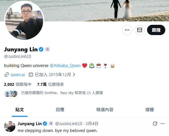 圖片來源:林俊暘社交媒體賬號截圖 前一天,林俊暘通過社交媒體公開宣布卸任阿里千問技術負責人職務。此次離職發生在其帶領團隊剛剛發布並開源Qwen3.5系列小模型之後,時間點較為突然。 3月2日,阿里千問正式開源Qwen3.5小尺寸模型系列(0.8B、2B、4B、9B)。 隨後,美國企業家、特斯拉及SpaceX首席執行官馬斯克在其社交媒體上評價這批模型,具備“令人印象深刻的智能密度(Impressive intelligence density)”。 公開資料顯示,林俊暘出生於1993年,本科就讀北京大學計算機科學專業,碩士階段在北京大學外國語學院完成,專業是語言學與應用語言學。其研究領域涵蓋自然語言處理與多模態表示學習,在NeurIPS、ICML、ACL等頂級會議發表多篇論文。 畢業後,林俊暘加入了阿里巴巴達摩院。2022年底,隨著阿里AI團隊整合,他進入新成立的通義實驗室,被任命為通義千問系列大模型的技術負責人。 自2023年開源以來,阿里已開源400多個千問模型。面向不同國家的AI開發者和企業的需求,千問大模型還在持續演進。(完) 【編輯:林曉惠】