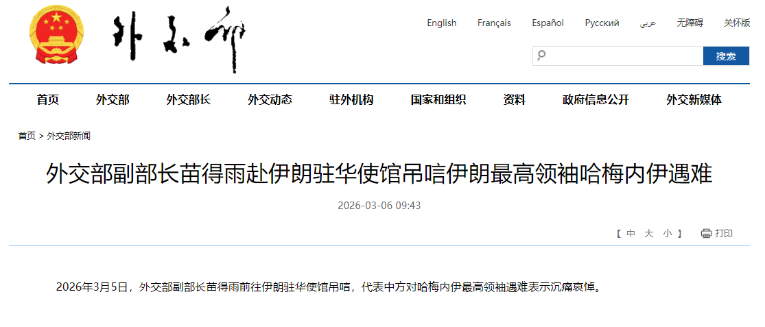 香港中通社3月6日電 據中國外交部3月6日消息,3月5日,外交部副部長苗得雨前往伊朗駐華使館吊唁,代表中方對哈梅內伊最高領袖遇難表示沉痛哀悼。