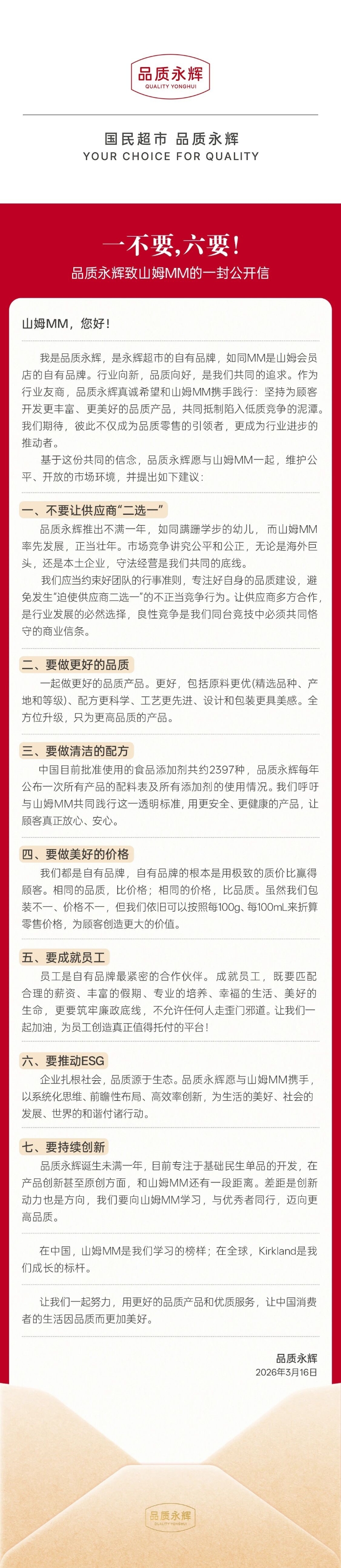致山姆MM的一封公開信 圖源:“品質永輝”公眾號 綜合17日消息,該公開信強調“行業向新,品質向好”的共同目標,提出七大共建倡議:包括杜絕“二選一”等不正當競爭行為、提升產品原料與工藝標準、公開配方添加劑信息、堅持質價比最優、保障員工權益、踐行ESG理念,以及持續產品創新。 品質永輝坦言,品牌成立未滿一年,在原創能力上與山姆及其對標品牌Kirkland仍有差距,但願以學習姿態加速成長,攜手為消費者提供更高品質的生活選擇。 值得注意的是,此次倡議發布前,山姆正因食品安全問題遭遇信任危機。3月14日,有消費者舉報山姆在售的“Botherless 有機凍乾草莓”農殘及重金屬鎘超標。 據報道,該產品生產商為福建立興食品股份有限公司,與今年1月福建漳州泰湖谷場食品負責人林女士自曝的問題凍乾草莓同源。林女士曾披露其採購自該廠的草莓檢出20餘種超範圍農藥及嚴重鎘超標,並多次向監管部門舉報。 目前,涉事商品已在山姆平台下架,客服表示已將問題轉交相關部門處理。(完) 【編輯:彭玉婷】