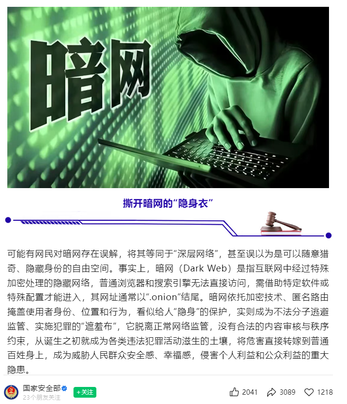 圖源:中國國安部公眾號截圖 據介紹,暗網是指互聯網中經過特殊加密處理的隱藏網絡,普通瀏覽器和搜索引擎無法直接訪問,需借助特定軟件或特殊配置才能進入,其網址通常以“.onion”結尾。暗網依託加密技術、匿名路由掩蓋使用者身份、位置和行為,看似給人“隱身”的保護,實則成為不法分子逃避監管、實施犯罪的“遮羞布”,它脫離正常網絡監管,沒有合法的內容審核與秩序約束,從誕生之初就成為各類違法犯罪活動滋生的土壤。 暗網是公民個人信息非法交易的核心渠道,身份證號、手機號、家庭住址等隱私數據,被不法分子通過黑客攻擊等手段竊取後,批量在暗網低價倒賣,直接侵害公民隱私和財產安全。 暗網中充斥著暴力血腥、網絡賭博、反動蠱惑等違法有害信息。境外間諜情報機關利用暗網隱匿特性,通過歪曲事實、煽動對立、製造恐慌等方式,誤導群眾認知、擾亂公共秩序,危害國家安全。 暗網非法交易毒品、管制器具、竊聽竊照器材等違禁品,這些違法交易看似遠離普通人生活,實則破壞社會管理秩序,讓民眾身處潛在危險之中。 面對暗網,中國國安部提出個人防護“四不”原則:不訪問,不自曝,不交易,不輕信。(完) 【編輯:彭玉婷】
