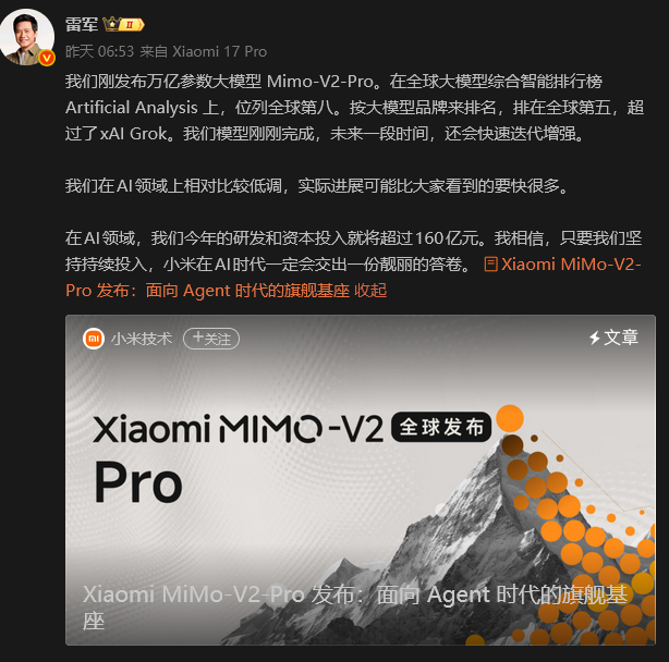 “雷軍”微博賬號截圖 另一方面,小米集團也在AI領域釋放重磅信號。19日凌晨,小米發布三款全新MiMo-V2系列大模型,包括萬億參數規模的旗艦基座模型MiMo-V2-Pro(支持百萬級上下文窗口)、全模態Agent模型 MiMo-V2-Omni(具備視覺、聽覺與推理執行能力),以及高擬真語音合成模型 MiMo-V2-TTS。據悉,MiMo-V2-Pro早前以匿名身份“Hunter Alpha”在OpenRouter平台引發廣泛關注。 小米創始人雷軍在當天的發布會透露,首款搭載MiMo大模型的終端產品——代號“龍蝦”的 Xiaomi miclaw手機已啟動封閉測試,將深度融合操作系統與“人-車-家”全場景生態。他強調,去年小米AI研發投入已超160億元(人民幣,下同),未來三年AI總投入將突破600億元;而未來五年,公司計劃在芯片、AI、操作系統等底層技術領域投入2000億元,力爭在今年實現自研芯片、澎湃OS與大模型的“三位一體”落地。 業界分析指,騰訊與小米分別推進AI工具普及與大模型終端化,折射出中國科技企業正從“模型競賽”轉向“場景落地”與“生態整合”的新階段。(完) 【編輯:彭玉婷】