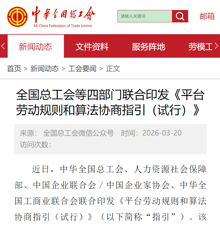 香港中通社3月20日電 據中華全國總工會20日消息,近日,中國印發《平台勞動規則和算法協商指引(試行)》(以下簡稱“指引”),旨在規範平台企業及其用工合作企業開展勞動規則和算法協商,加強新就業形態勞動者權益保障,推動構建和諧穩定的平台用工關係,促進平台經濟持續健康發展。