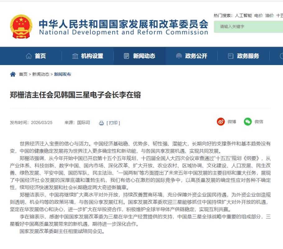 圖源:中國國家發改委網頁截圖 據中國國家發改委公眾號消息,鄭柵潔指出,當前中國經濟基礎穩固、優勢突出、韌性強勁、潛力巨大,長期向好的基本趨勢沒有改變。作為全球第二大經濟體,中國將持續為動蕩的世界經濟注入確定性與新動能。他強調,從今年起實施的“十五五”規劃明確了未來五年在科技創新、數字中國、產業升級、綠色發展等領域的重點任務,彰顯了中國推動高質量發展的堅定決心。 鄭柵潔表示,歡迎三星把握中國新一輪開放機遇,堅定在華發展信心,進一步擴大投資合作,共同維護全球半導體產業鏈供應鏈穩定,實現互利共贏。 李在鎔感謝中國發展改革委長期以來對三星在華運營的支持,強調中國在三星全球戰略布局中佔據重要地位。他表示,三星高度看好中國高質量發展帶來的新機遇,願積極參與“十五五”相關重點領域合作,深化在華業務布局,推動雙方合作邁向更高水平。(完) 【編輯:彭玉婷】