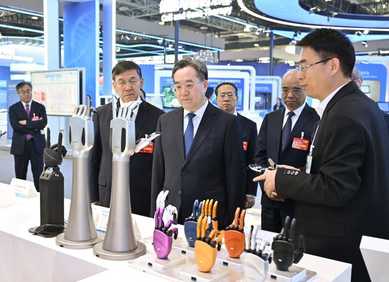 中關村論壇年會25日在中國北京開幕。中國國務院副總理丁薛祥出席開幕式並致辭。這是開幕式後,丁薛祥巡視中關村展示中心常設展,與科技人員進行交流。圖片來源:新華社