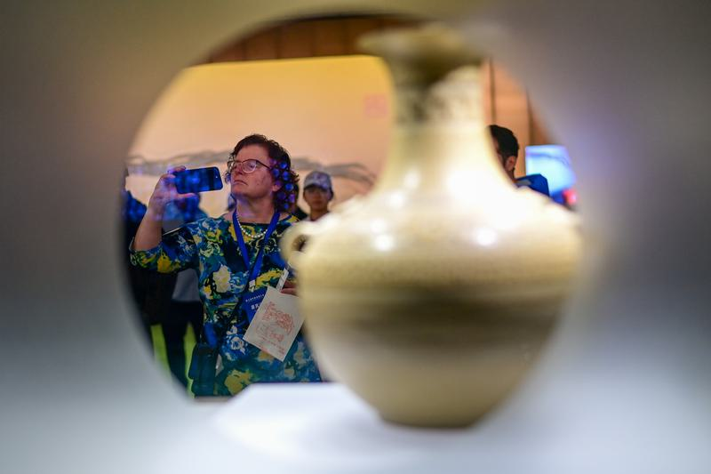 2025年10月26日,參加第七屆中美友城大會的嘉賓參訪之江文化中心浙江省非物質文化遺產館。新華社照片