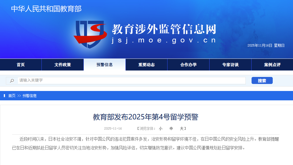 香港中通社11月16日電 11月16日,中國教育部發布2025年第4號留學預警,建議中國公民謹慎規劃赴日留學安排。