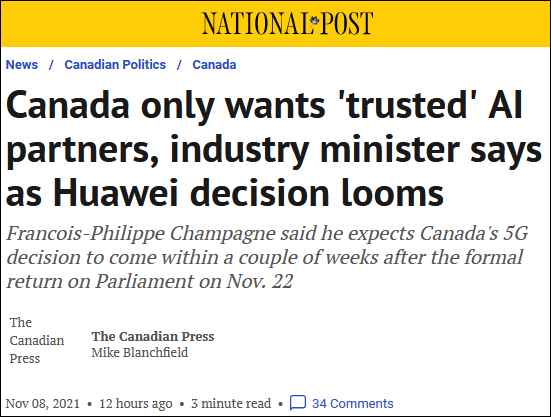 加拿大即將就5G供應商作出選擇,加官員“強烈暗示將禁用華為”在有關華為的問題上,“五眼聯盟”成員國中唯有加拿大遲遲未正式表態如何對待華為。如今,在這一決定結果即將揭曉前,加拿大政府官員已在“瘋狂暗示”。 據加拿大通訊社(The Canadian Press)當地時間11月8日報道,加拿大創新、科學及工業部長商鵬飛(Francois-Philippe Champagne)當天在德國接受採訪時表示,在未來的人工智能項目中,加拿大只想與“可信任的合作夥伴”(trusted partners)打交道。 商鵬飛還表示,他預計加拿大有關5G網絡的決定,將會在11月22日新一屆國會復會和開議後的幾周內正式作出。 加通社指出,商鵬飛面對媒體所說的這番言論,事實上是發出了一個強烈的信號,即加拿大即將拒絕中國通訊科技巨頭華為作為其國內5G網絡的供應商。