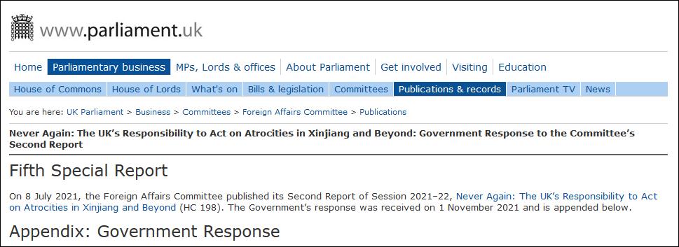 英國議會官網11月14日公佈了政府對涉疆報告的回復 今年4月,英國議會下院通過動議,認定新疆存在所謂的“種族滅絕”。在第1條建議中,外交事務委員會鼓動英國政府接受議會對新疆問題的看法,並採取行動結束這些“罪行”。 然而,這第一條建議就被英國政府給否了。英國政府回復稱,英方的一貫政策是不會認定是否存在“種族滅絕”,這是一種犯罪,應該在掌握了所有現有證據後,交由可信的司法程序處理。但英國政府也辯稱,英方將繼續同國際夥伴採取行動向中方施壓。 在第23條建議中,外交事務委員會鼓動政府“考慮禁止進口所有使用被指涉及強制勞動的新疆棉花產品”,並將這項禁令擴展到棉花以外的行業。英國政府表示,目前並沒有計劃禁止中國相關產品進口,但會與國際夥伴合作確保供應鍵不涉及強制勞動。 此外,英國政府還拒絕了幾項涉疆提議。比如針對第5條建議“就新疆問題緊急向聯合國消除種族歧視委員會(CERD)投訴”,英國政府也拒絕採納。英國政府稱,這種做法可能會讓新疆問題演變成中英雙邊的爭端,有違英國政府處理此事的觀點,即“協調一致的國際壓力”是影響中國最有效的手段。又例如第6條建議敦促英國政府“推動聯合國人權理事會尋求解決新疆問題”,英政府在回復中稱,盡管這一方法“原則上是有價值的”,但在現實中還缺乏足夠的支持。 外交事務委員會還在第11條建議中呼籲政府抵制2022年北京冬奧會,並向本國奧委會施壓;哪怕抵制不成功,也要禁止官員出席冬奧會的相關活動,呼籲遊客避免前往中國,建議英國運動員不要參加開閉幕式等。英國政府則回應說,政府層面尚未就北京冬奧會作出決定,是否參加奧運會應由英國奧委會獨立作出決定。 不過,英國政府也同意了其中一些內容。比如第9條“政府應該帶頭建立民主國家聯盟,通過聯合國和其他機構協調新疆行動”,以及27條“敦促國際勞工組織對新疆進行全面審查”等條目。