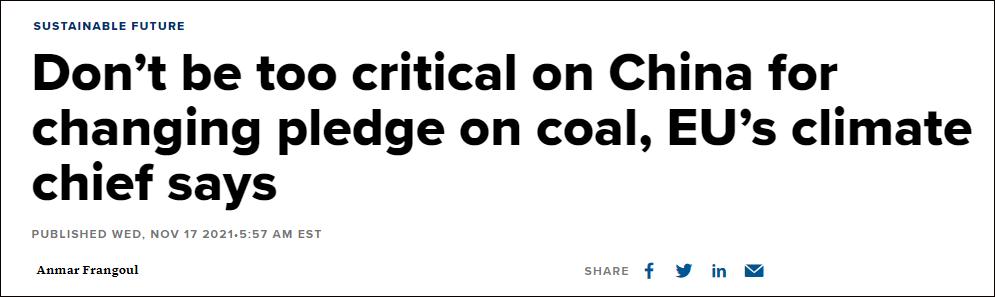 美媒CNBC報道截圖 COP26談判一直持續到13日晚,各國政府就“逐步淘汰煤炭”、“減少溫室氣體排放”和“向貧困世界提供資金”的條款爭論不休。 在會議“最後關頭”,印度環境和氣候部長提出了一個被中國等發展中國家支持的意見,要求將協定中的“逐步淘汰”煤炭改為“逐步減少”。隨後,“歷史性協定”終於通過。 在17日的報道中,CNBC字裏行間指責中國和印度,認為中印是“世界上最大的煤炭消耗國”,最後卻修改淘汰煤炭的措辭。 但對於中國在COP26會議上做出的承諾是否達到預期一事,歐盟氣候專員、歐盟委員會負責歐洲綠色交易的執行副主席提孟思和CNBC看法不同,給出了否定回答。 “不,我不這麽認為。”提孟思表示,即便中國和美國之間存在許多分歧,但最終還是發表了聯合宣言,這就說明氣候問題對中美來說“超越了其他政治議題”。