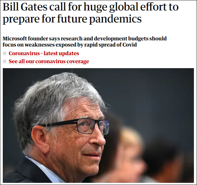 英國《衛報》11月4日報道截圖 據英媒報道,蓋茨日前在參加英國智庫機構“政策交流”(Policy Exchange)的一場活動時表示,各國政府必須通過投資數十億美元進行研發,為未來的流行病和天花“恐怖襲擊”做好準備。 當時,他提出一個假設:“如果有一個‘生物恐怖分子’將天花(病毒)帶到10個機場呢?全世界對此會如何應對?” 蓋茨補充稱:“有自然引起的流行病,也有生物恐怖主義引起的流行病,這些流行病甚至可能比我們今天經歷的要糟糕得多。然而,醫學科學的進步應該給我們提供工具,你知道,我們可以做得更好。” 【編輯:胡雪石】