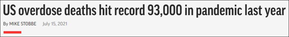 題為“拜登總統關於去年美國藥物過量死亡人數超10萬的聲明”。來源:白宮網站聲明截圖 美聯社稱,最新的死亡數據是美國疾病控制與預防中心(CDC)提供的,他們根據迄今為止收到的9.8萬份死亡報告做出了估計,結論是在2020年4月到2021年4月,約有100300名美國人死於藥物注射過量。報道稱,這不是一個正式的統計結果,確切數據預計還得等幾個月才能出來。 今年7月,CDC曾發佈正式報告,稱美國2020年全年約有9.3萬人死於藥物注射過量,創下歷史新高。有CDC官員表示,2021年這一數據預計將超過10萬。