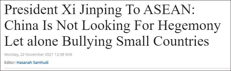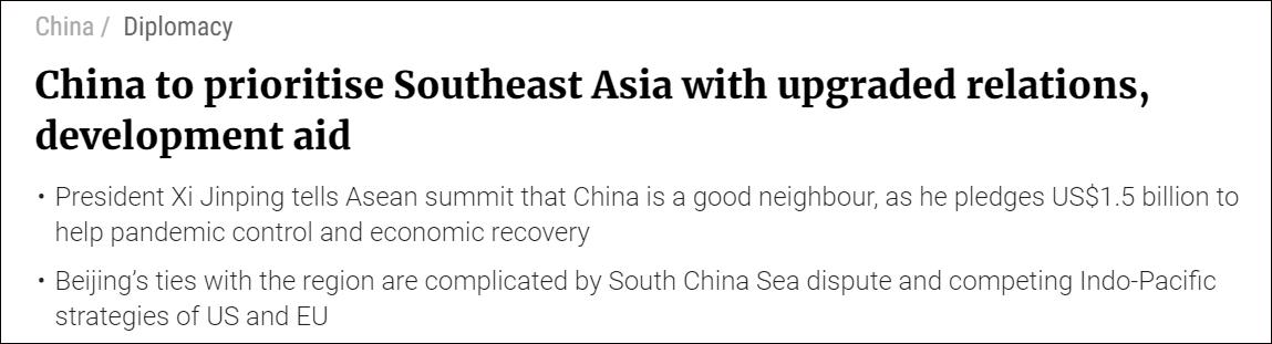 《南華早報》報道截圖 “多年來,中國與東盟之間的安全合作一直不夠。”國家南海研究所副研究員陳向渺告訴《南華早報》,中國和東盟尚未建立正式的國防部長對話機制,雙方可以為此努力。 顯然,美國一部分學者已經對中國東盟關係升級產生警惕。據半島電視台22日報道,美國智庫“外交關係委員會”東南亞研究員喬什·庫蘭茨克(Josh Kurlantzick)在對緬甸、南海問題指手畫腳後,又將東南亞議題扯進中美關係中。 “中國將與東盟關係升級為全面戰略夥伴關係,並想借此大力宣傳一點,即‘與美國不同的是,中國與東南亞正在進行的經濟一體化密切相關。”庫蘭茨克聲稱,中國提升與東盟的關係,是在將自己展示為“比美國更可靠的”經濟夥伴。 東盟各國媒體關注中方“堅持對話不對抗”承諾 除美國學者外,一向關注中國各方面動向的歐美媒體迅速跟進。其中,路透社和美國有線電視新聞網(CNN)在報道中提到了中方關於“共建和平家園”的承諾。 中方領導人在視頻峰會上強調,中國過去是、現在是、將來也永遠是東盟的好鄰居、好朋友、好夥伴。中方堅決反對霸權主義和強權政治,願同周邊鄰國長期友好相處,共同維護地區持久和平。 澳聯社則注意到中方啟動的“中國東盟健康之盾”合作倡議和“共建繁榮家園”承諾,其中提到,中方願在未來3年再向東盟提供15億美元發展援助,用於東盟國家抗疫和恢復經濟。 但與此同時,上述歐美媒體均在報道中提及菲律賓補給船近日擅闖中國南沙群島仁愛礁附近海域一事,並借機炒作南海問題。我外交部發言人此前就此回應稱,中國海警船依法執行公務,維護中國主權和海上秩序。目前仁愛礁海域總體平靜,中菲雙方就此保持著溝通。 值得一提的是,馬來西亞外長在此次峰會上指出,盡管一些東盟國家在南海問題上存在爭議,但這不應該成為阻礙中國與東盟十國之間關係的問題所在。 與歐美媒體不同的是,東盟各國媒體均對中國與東盟間關係升級評價積極。 新加坡《聯合早報》和印尼“論壇”新聞網(Tribunnews)注意到,中方領導人提到,中國要做地區和平的建設者和守護者,堅持對話不對抗、結伴不結盟,攜手應對威脅破壞和平的各種負面因素。