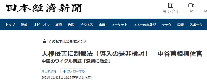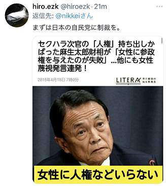 《日本經濟新聞》:首相輔佐官中谷稱,“應探討是否通過”侵犯人權制裁法案,對中國涉疆問題“強烈關切” 不過,有些日本網友在看到《日本經濟新聞》推文題為“首相輔佐官中谷:‘應探討是否通過’侵犯人權制裁法案”的報道後想到了日本自民黨和美國。有網友評論稱,“那最先被制裁的應是自民黨”,並貼出了自民黨“大佬”麻生太郎“賦予女性參政權真是失敗”等歧視女性言論相關報道。