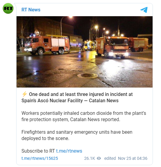 “今日俄羅斯”(RT)報道截圖 據“今日俄羅斯”(RT)11月25日報道,該工廠和地方當局確認,該事件未引發放射性物質泄露。 消防部門在與核電站工作人員共同檢查排氣扇並確保系統正常工作後,離開現場。 2007年11月,阿斯科核電站因1號機組反應堆的輻射泄漏而受到調查。2009年5月11日,西班牙有關部門宣佈,阿斯科核電廠運營者因該廠發生少量放射性物質釋放且未能做出適當的控制和溝通而被罰款2100萬美元。這是西班牙電廠有史以來最大的一筆罰款。 此次事件沒有造成人員放射性感染,但約有800人接受了體檢。該事件被劃為國際核事件分級表(INES)中的二級事件。