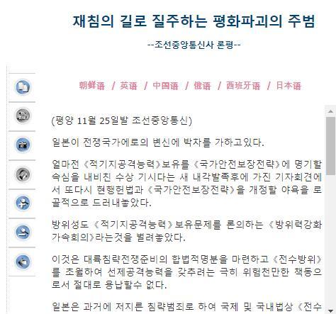 “朝中社評論:在重新侵略不歸路上發足狂奔的和平破壞主敵。”朝中社25日以此為題刊發評論文章痛批日本,指出“日本正在快馬加鞭地奔馳向變身為戰爭國家之路”,同時提醒國際社會“須對日本威脅人類未來的軍國化、軍事大國化活動提高警惕”。