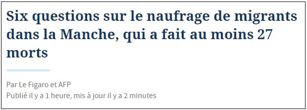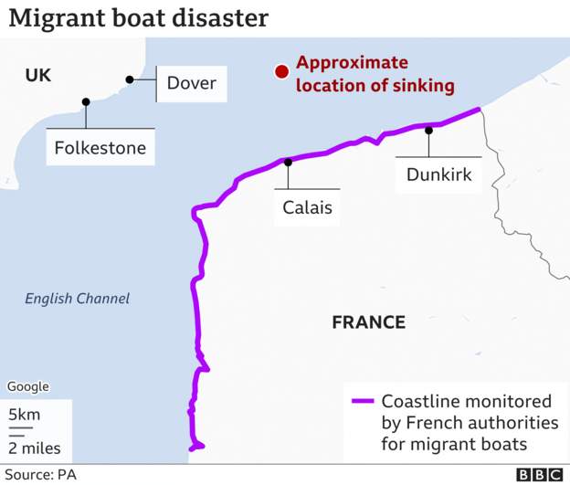 11月24日,法國加來正在準備轉移遇難者的遺體。 英國首相鮑里斯·約翰遜聲稱,這起事故“凸顯了法國政府的海岸巡邏力度還不夠”,他說:“我們很難說服我們的一些合作夥伴,特別是法國人,以在我們眼中合乎情況的方式行動……我理解所有國家都有各自的問題,但我們現在想要的是共同做更多的事。” 英國《衛報》稱,此前英國想要派遣警察和邊防部隊前往法國,並與後者聯合在法國海岸線展開巡邏行動,但法國方面出於對國家主權的考慮拒絕了這項提議。