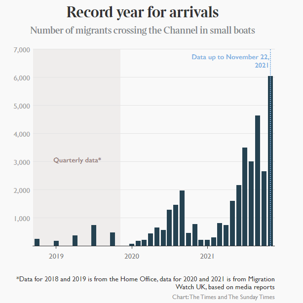 翻船的大概位置。圖源:BBC 而在另一邊,作為英法交通的主要樞紐之一,法國加來市的市長娜塔莎·佈夏爾(Natacha Bouchart)強調這起慘案應該歸咎於英國人。她呼籲鮑里斯約翰遜“正視自己的責任”,並聲稱“英國政府是罪魁禍首……而我認為鮑里斯·約翰遜在過去一年半里一直在憤世嫉俗地指責法國。” 加來位於英吉利海峽最狹窄地區的法國一側,同時也是英吉利海峽隧道法國一端的出口所在地。長期以來,這座城市都是試圖經法國偷渡前往英國的偷渡客們最為密集的地區,特別是在2014年歐洲難民危機發生以來,該地更是出現了大量以英國為目的地的難民。英國《泰晤士報》在相關報道中指出,今年以來橫渡英吉利海峽的難民數量劇增,截至11月22日,僅過去的22天中就有多達6059名難民抵達英國,遠遠超出了過去三年間任何一個月的數據。