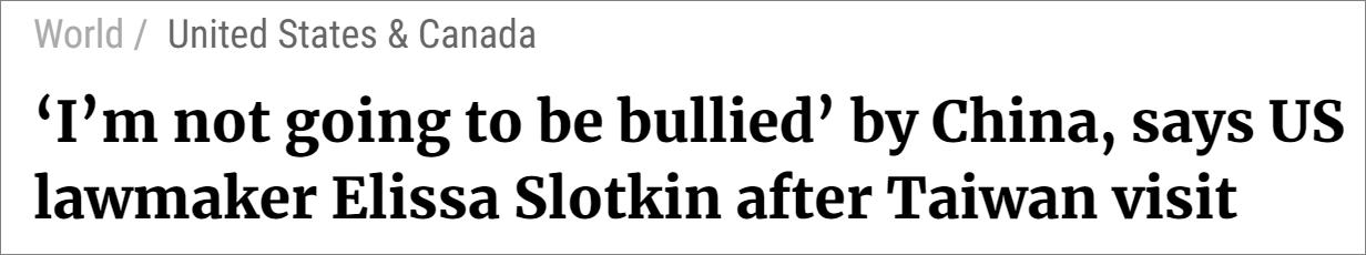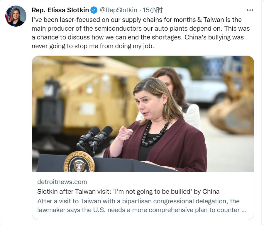 “訪問”台灣地區可以彰顯“沒被中國欺負”? 據美國芝加哥論壇新聞網(TNS)、底特律新聞網報道,美國眾議院議員埃莉莎·斯洛特金(Elissa Slotkin)11月30日發表了一番迷惑發言。她聲稱,中國駐美大使館曾於25日發郵件勸阻她不要“訪問”台灣地區,但她還是去了,這顯示了她“沒有被中國欺負”。