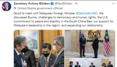 馬來西亞總理(左)與布林肯15日舉行會談,圖自社交媒體 在隨行人員確診的消息確定前,15日早些時候,布林肯與馬來西亞總理伊斯邁爾、外長賽夫丁、能源部長等高級官員和美國駐馬來西亞大使會談,並出席了美國政府推動成立的地區交流組織“東南亞青年領袖倡議”(YSEALI)在吉隆坡舉行的活動。 按照原計劃,布林肯會在15日結束在馬來西亞的行程後,前往並抵達泰國。 【編輯:俞丹鳳】