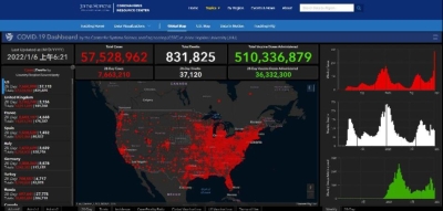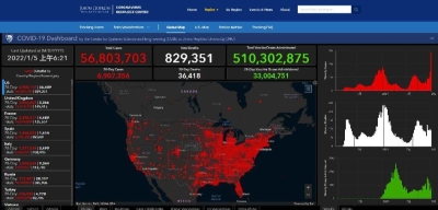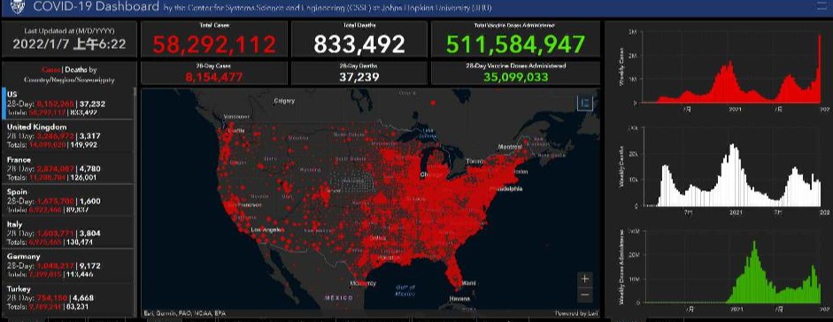 根據美國約翰斯·霍普金斯大學統計數據,截至北京時間2022年1月4日7時22分,美國新冠肺炎累計確診病例達到56091119例,累計死亡病例達到827701例。在過去約25小時裏,美國新增確診病例1021772例,新增死亡病例1695例。