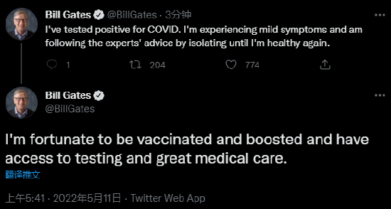 比爾蓋茨社交媒體截圖 據報道,現年66歲的蓋茨在社交媒體上發文稱,“他出現了輕微的症狀,正‘聽從專家的建議進行隔離’,直到恢復健康為止。” 報道稱,蓋茨還表示,他已經完全接種了疫苗和加強針,並且獲得了“優質的醫療服務”。 據報道,近期,包括美國國務卿布林肯、紐約州州長等在內的多位美國政要名人感染新冠。當地時間5月4日,美國國務院新聞發言人普萊斯(Ned Price)表示,布林肯感染新冠病毒,目前出現輕微症狀,將居家辦公至隔離期滿。 另外,當地時間8日,紐約州州長凱茜·霍楚爾在社交媒體表示她的新冠病毒檢測呈陽性,將居家隔離一周。此前不久,紐約市長亞當斯也感染了新冠病毒。據美聯社統計,霍楚爾是迄今至少第18名新冠病毒檢測結果呈陽性的美國州長。(完) 【編輯:俞丹鳳】