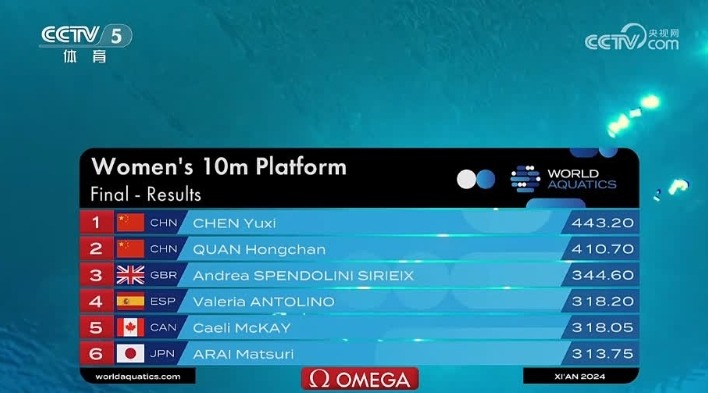中國選手包攬世錦賽跳水女子10米臺冠亞軍。圖源:新華社 中國選手包攬金、銀牌不出意料,唯一懸念是兩位小將誰能更勝一籌。東京奧運會該項目角逐中,全紅嬋力壓陳芋汐奪冠,此次世錦賽上兩人名次互換。 預賽和半決賽中,陳芋汐總分保持領先。決賽前兩跳下來,全紅嬋領先,但第三跳全紅嬋207C出現失誤,入水姿態不佳,陳芋汐反超至第一。最後兩跳,陳芋汐動作也出現瑕疵,最終以417.25分奪冠。全紅嬋僅落後0.3分,以416.95分摘銀。馬來西亞選手潘德莉拉·帕姆格以338.85分獲得銅牌。
