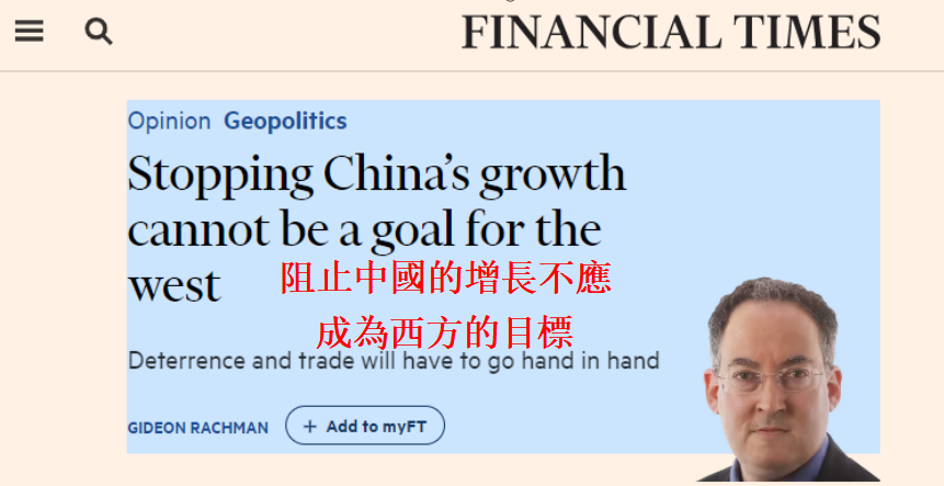 英國《金融時報》報道截圖 文章稱,一些人對“2023年的危機之一是中國經濟增長的放緩”這一觀點表示懷疑。畢竟,在美國總統拜登多次表示願意為“保衛台灣”而與中國開戰,歐盟稱中國為“系統性競爭對手”,以及英國將中國列為“威脅”的情況下,西方并不希望看到中國經濟的快速增長。 然而,另一些人卻認為,中國經濟的持續發展是符合西方利益的。首先,中國是世界經濟的重要組成部分。如果中國陷入衰退,那麼整個世界也將陷入衰退。假如中國崩潰了,(例如其房地產行業的崩潰),將波及全球的金融體系。 其次還有道德問題。如果有人希望14億中國人變窮,那麼他們會因此感到內疚嗎?另外,中國的需求和投資對非洲和美洲國家而言也至關重要。那麼他們會願意看到非洲和美洲國家也變得更窮嗎?
