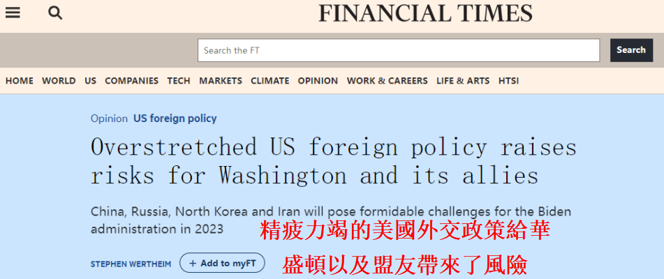 英國《金融時報》報道截圖 文章稱,從阿富汗混亂撤軍的焦慮中走出來的美國,如今再次“感受到了其全球力量的重要性”,并由此產生了一種“使命感”——即擊退中國和俄羅斯的“侵略”。 美國的“滿足感”來自於,在俄烏戰爭爆發後,美國總統拜登團結了西方并避免了北約的直接參戰。但從長遠來看,美國的傳統做法開始顯得“可疑”。 從阿富汗撤軍後,美國可以專注於其它更重要的事情,然而,所有的戰略挑戰都在2022年變得“更加糟糕”。 美國的盟友們應該很想知道,一個“精疲力竭”的超級大國是否有能力在他們需要的時候伸出援手。