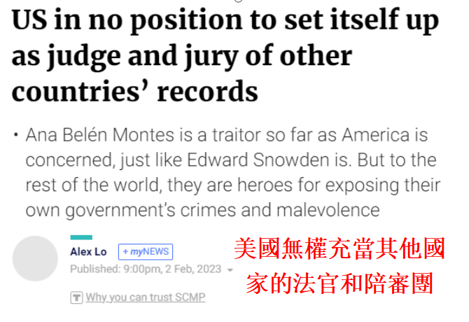 香港《南華早報》報道截圖 文章稱,美國國務院剛剛宣佈了其年度“全球人權捍衛者獎”的10名獲獎者。美國作為世界上最好戰的國家、侵犯全球人權的慣犯和戰爭犯,他將自己稱作其他國家(尤其是美國的“敵對國家”)的“法官和陪審團”,這具有極其諷刺的意味。 與此同時,前美國國防情報局分析員安娜·貝倫·蒙特斯在服完其25年有期徒刑中的20年後於上個月獲釋。她因向古巴政府提供機密信息使古巴免受美國的侵略而入獄。 蒙特斯作為一名波多黎各人,她發表了一項聲明以譴責美國對古巴長達六十年的封鎖,以及美國政府對波多黎各人民所經歷的苦難的忽視。 就美國而言,她是一個“叛徒”,但對於世界其他地方來說,她是揭露美國政府罪行和惡意的“英雄”。在被審判的過程中,蒙特斯表示:“我服從了我的良心,而不是法律”。 “我認為美國政府對古巴的政策是殘忍和不公平的,從道義上來說,我有義務幫助古巴抵禦美國將其價值觀和政治制度強加於古巴的企圖。”