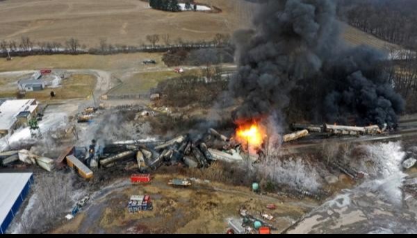 圖:新華社 綜合報道,出事貨運列車有超100節車廂,其中約50節車廂當地時間3日晚在俄亥俄州東部鄰近賓夕法尼亞州的小鎮東巴勒斯坦城(East Palestine)脫軌引發火災。涉事列車共有20節車廂裝載有毒物質,其中一半脫軌,當中包括5節運載壓縮氯乙烯的車廂。 據視頻畫面顯示,事故現場火光衝天、濃煙彌漫,滾滾濃煙甚至能在氣象雷達上顯示,還飄散到附近小鎮。