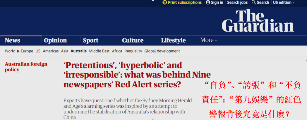 香港新聞網3月16日電 英國《衛報》今日發表題為《“自負”、“誇張”和“不負責任”:“第九娛樂”的紅色警報背後究竟是什麼?》的文章。文章稱,在上周澳大利亞最大的兩家報紙在其頭版發佈對華“紅色警報”後,至今仍在遭受澳大利亞前總理、外交事務專家和大學教授們的集體聲討。
