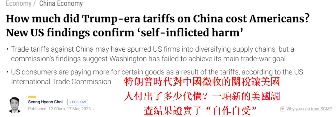 香港《南華早報》報道截圖 美國國際貿易委員會是一個獨立的政府機構,負責調查中美貿易戰對美國經濟的影響。該委員會的一份報告顯示,受影響最嚴重的行業,如計算機設備、半導體、傢具、音視頻設備等的中國進口價格比2021年增長了25%。 特朗普於2018年7月宣布了對包括半導體和化學品在內的中國商品征收一系列關稅。報告顯示,該關稅政策於2018年和2019年施行,對中國商品加征了7.5%-25%的關稅,但這導致了部分行業的美國產品價格上漲了3%至4%。 另外,同樣在2018年,特朗普政府以“保護國家利益”為由,依據1962年《貿易擴張法》第232條,對進口鋼鐵和鋁產品加征關稅。 美國國際貿易委員會發現,在加征關稅以後,美國鋼鐵產品的進口量減少了24%,價格上漲了2.4%,而鋁產品的進口量也下降了31%,價格上漲了1.6%。 對此,新加坡智庫東南亞研究所的高級研究員賈揚特·梅農表示,“實際上此類關稅不會影響進口商,甚至外國出口商。從理論和證據來看,這非常清楚且毫無疑問,實際關稅會影響最終消費者和實際購買產品的商家。”