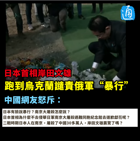日相跑到烏克蘭譴責俄軍“暴行”,中國網友:南京大屠殺怎麼說?分享到: